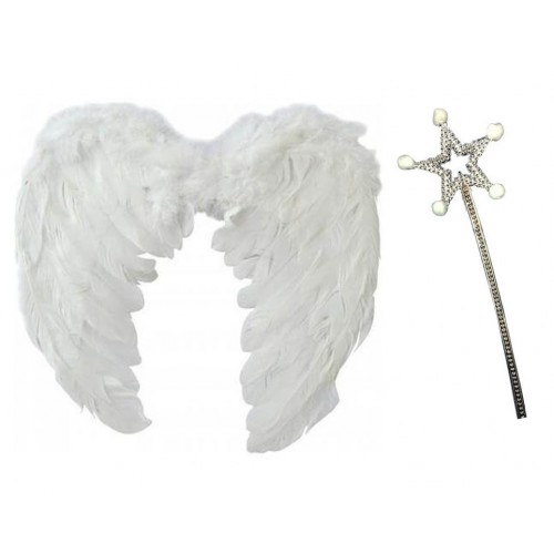Beyaz Renk Orta Boy Çocuk Melek Kanadı 35x50 Cm Ve Beyaz Ponponlu Asa