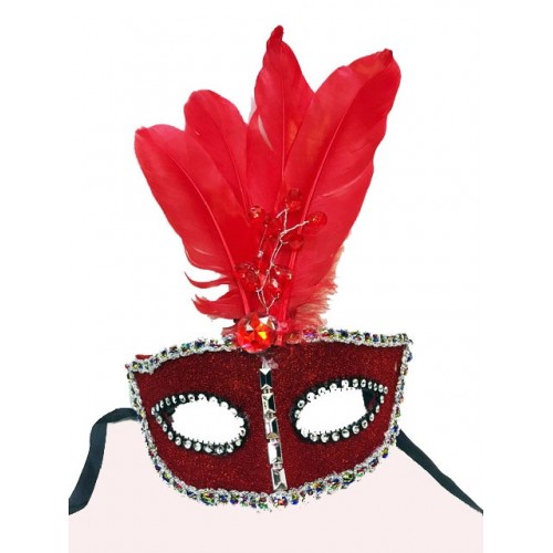 Boncuk İşlemeli Dantelli Tüylü Yılbaşı Parti Maskesi Kırmızı Renk