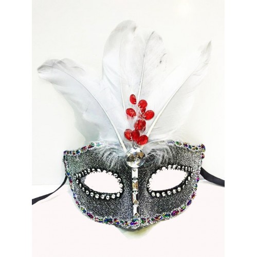 Boncuk İşlemeli Dantelli Tüylü Yılbaşı Parti Maskesi Gümüş Renk