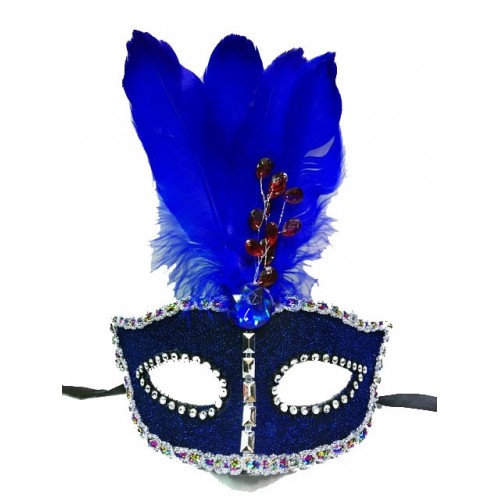Boncuk İşlemeli Dantelli Tüylü Yılbaşı Parti Maskesi Mavi Renk
