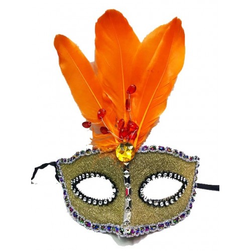 Boncuk İşlemeli Dantelli Turuncu Tüylü Yılbaşı Parti Maskesi Gold Renk