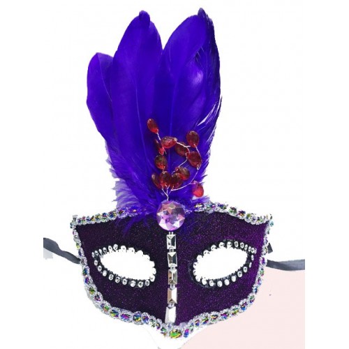 Boncuk İşlemeli Dantelli Mor Tüylü Yılbaşı Parti Maskesi Mor Renk