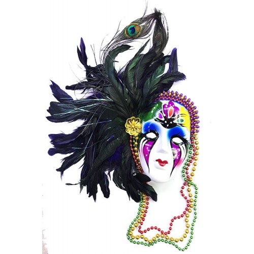 Ekstra Bol Gerçek Tüylü Boncuklu Asma Aparatlı Dekoratif Seramik Venedik Maske