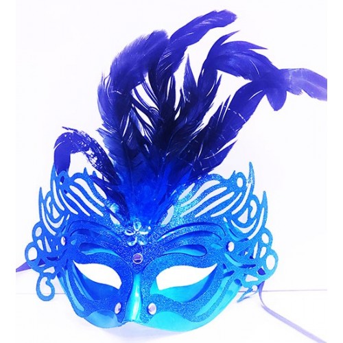 Metalize Mavi Renk Tüylü Lüks Venedik Parti Balo Maskesi