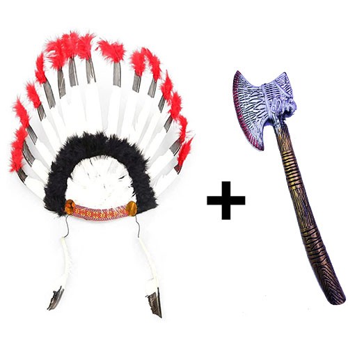Siyah Beyaz Kızılderili Tüylü Başlık Ve Plastik Kızılderili Baltası