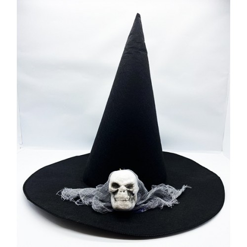 Siyah Renk Gri Duvaklı Kuru Kafa Temalı Cadı Şapkası 35x38 Cm