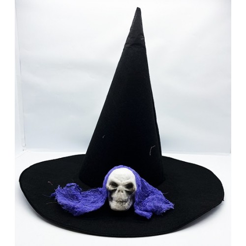 Siyah Renk Mavi Duvaklı Kuru Kafa Temalı Cadı Şapkası 35x38 Cm